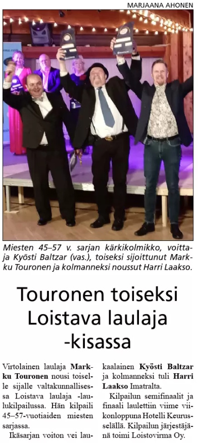 Ihan mukavastihan eli suorastaan loistavasti 2. sija tuli saavutukseksi Loistava Laulaja -laulukilpailuissa! Ohessa Suomenselän Sanomien uutinen asiasta (julkaistu 29.1.2026).